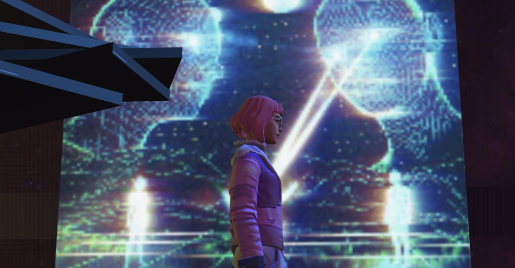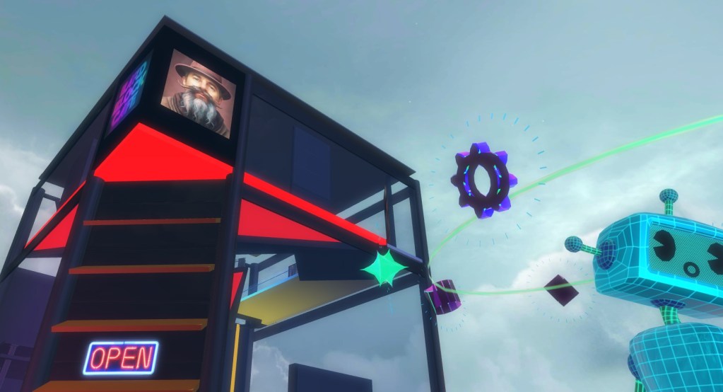 Now, to my absolute favorite aspect of this build, the outdoor space, which is nothing short of entertaining and amazing. As Metaverse explorers journey to the outer area of this venue they will be delighted to see a larger-than-life robot placed alongside this build. Adding a sense of fun and tying it all together. The robot glows radiant blues and greens, while motioning around in all directions. I found myself mesmerized as the robot would change faces, and spin around various geometric shapes in glee. It was hard to not be entertained by this cheerful feature added to this Web World. A beacon of fun to remind everyone to not take things so seriously and to just have fun with it – at least, I think so.