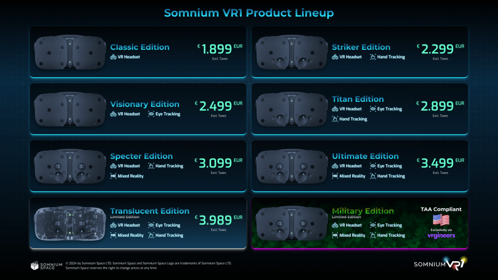 And here it is, the complete Somnium VR1 lineup with pricing info.