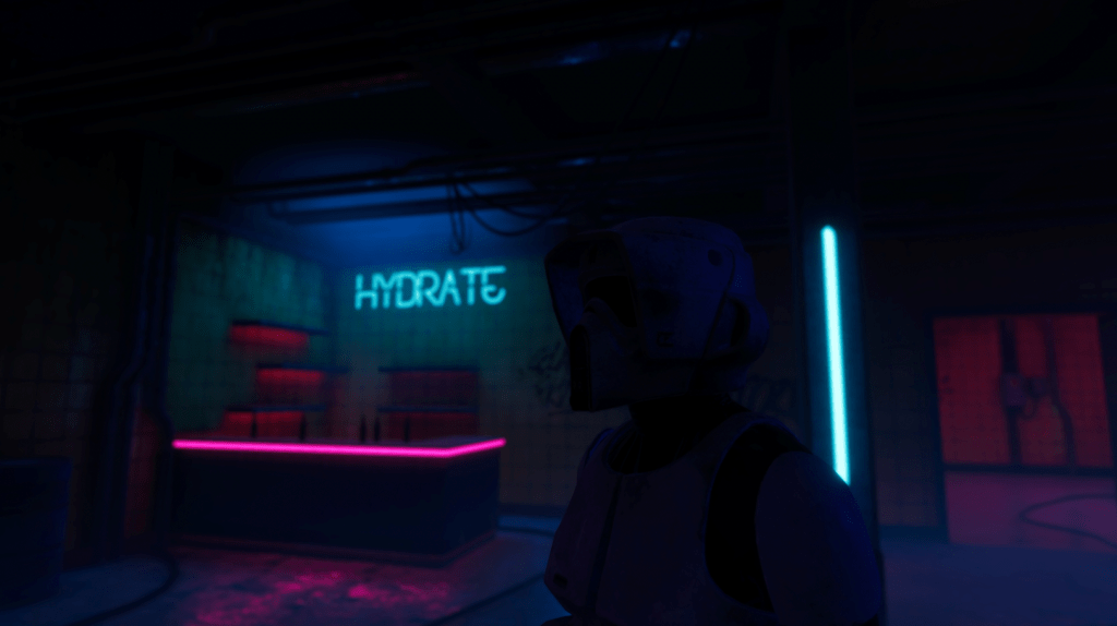From the moment you step into Neon Bunker, you’re enveloped in a futuristic, neon-drenched environment that feels both gritty and glamorous. The bunker’s design features a striking palette of purples, blues, and pinks, with glowing accents that highlight its industrial architecture. Tiled walls adorned with graffiti and sleek, neon-lit pathways create an urban underground feel, reminiscent of a cyberpunk nightclub. The attention to detail is amazing, and the music that is being played enhances the immersive experience whether you’re in VR or on a 2D desktop interface.