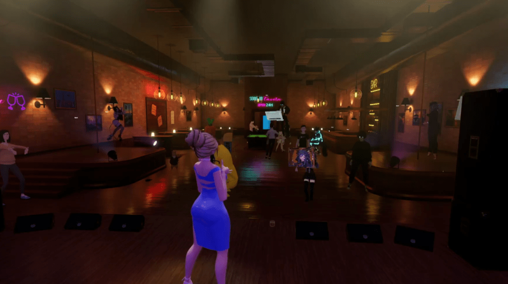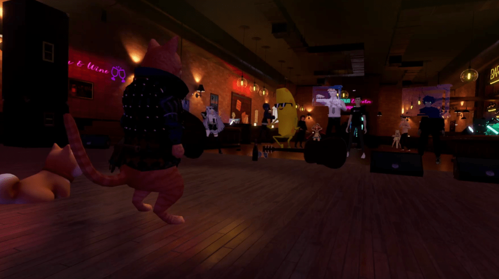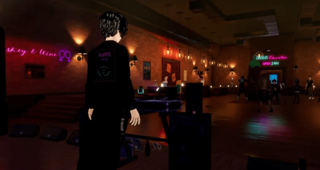 Right from the start, guests were swept into an ambiance of nostalgia and refined charm. The evening was packed with unforgettable moments – Haru captivated with her silky vocals and magnetic presence, breathing new life into timeless jazz classics. MrOxatan followed with heartfelt songs and graceful guitar accompaniment, adding a soulful layer to the night. And then there was DJ Lanzor, who energized the venue with his smooth, swinging jazz beats, keeping the rhythm alive and the crowd moving. Accompanied by a visually stunning backdrop, the acts set a captivating tone, drawing avatars of all kinds into the experience. The Tavern overflowed with energy that lit up the virtual space, with participants ranging from sleek, futuristic designs to whimsical characters like carrots and bananas. The dance floor pulsed with movement, and real-time conversations flowed seamlessly, showcasing the advanced technology and vibrant community spirit of Somnium Space.