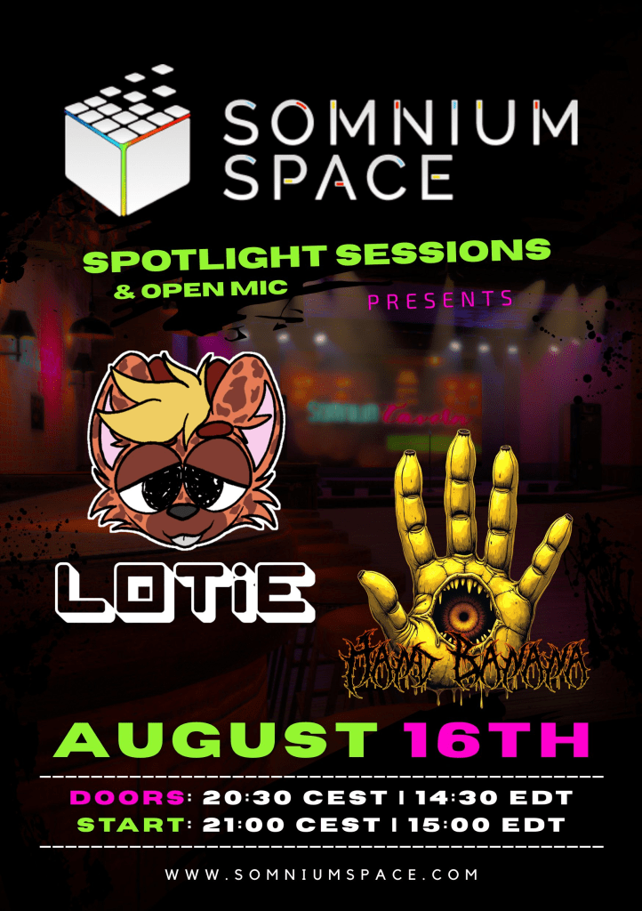 On August 16 at 20:30 CEST, the cozy virtual doors of Somnium Tavern swing open for another night of music, creativity, and community. This time, the Spotlight Sessions feature live sets by Lotie and Hand Banana, two artists ready to bring energy straight into Somnium Space.