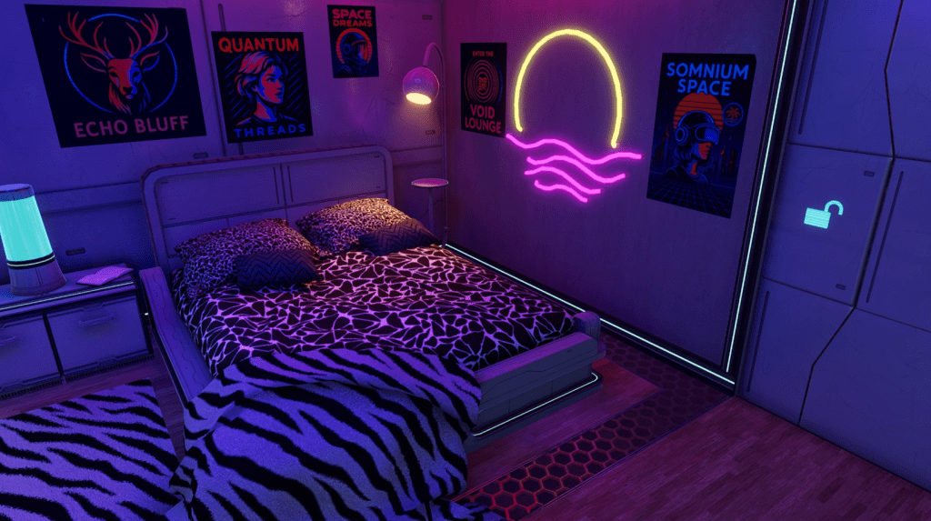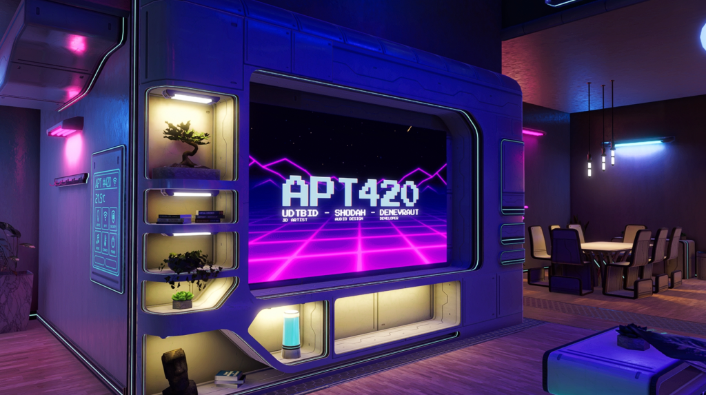 Apartment 420 is not just a virtual residence; it’s a meticulously designed environment that transports users into a neon-lit, cyberpunk-inspired world. The apartment features a sleek, modern aesthetic with bold purple and blue lighting accents that illuminate every corner. From the moment you step inside, you are greeted by a vibrant cityscape visible through expansive windows, complete with towering skyscrapers adorned with glowing advertisements. This backdrop sets the tone for a virtual, auditory experience that feels both futuristic and lived-in, blending high-tech ambiance with cozy, personalized touches.