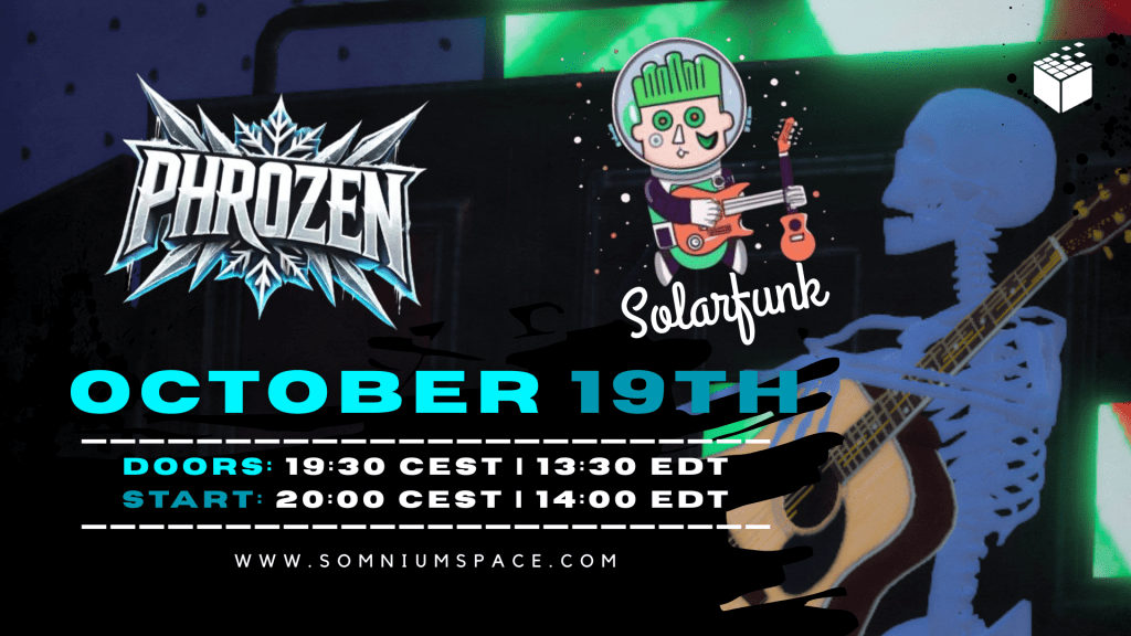 The festivities kick off in the iconic Somnium Tavern World at 7:30 PM CEST (1:30 PM EDT), when the virtual doors swing open to welcome attendees to an immersive experience. The stage is set for a dynamic lineup, starting with two incredible headline acts that are sure to get the crowd buzzing. At 8:00 PM CEST (2:00 PM EDT), Solarfunk will take center stage, bringing his signature funky grooves and infectious rhythms to the Somnium Space audience. Known for his awesome performances and soulful sound, Solarfunk is guaranteed to set the perfect tone for the night.