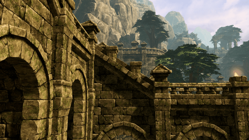 The attention to detail is extraordinary. Lush greenery clings to every surface, blending nature seamlessly with the hand-built stonework. Towering trees with glowing canopies stand sentinel beside flame-lit braziers that cast warm, flickering light across cobblestone courtyards. Subtle environmental effects, drifting mist, soft volumetric lighting, and the gentle play of sunlight filtering through clouds, create an atmosphere that is at once serene and awe-inspiring.